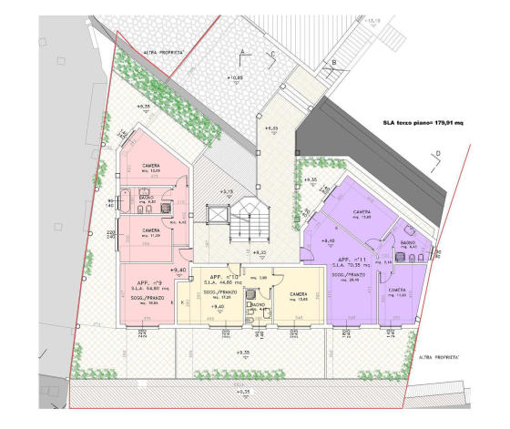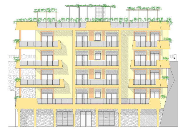 E’ stato realizzato un nuovo edificio costituito da cinque piani fuori terra, di cui il primo a destinazione commerciale e gli altri residenziali, e da un piano interrato al quale si accede dall’antistante Via Torino mediante una rampa carrabile.